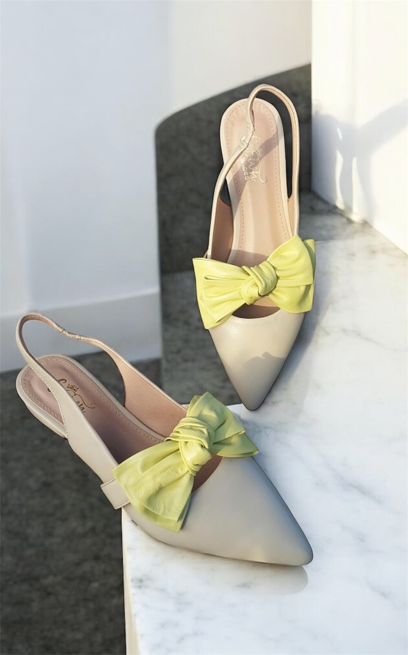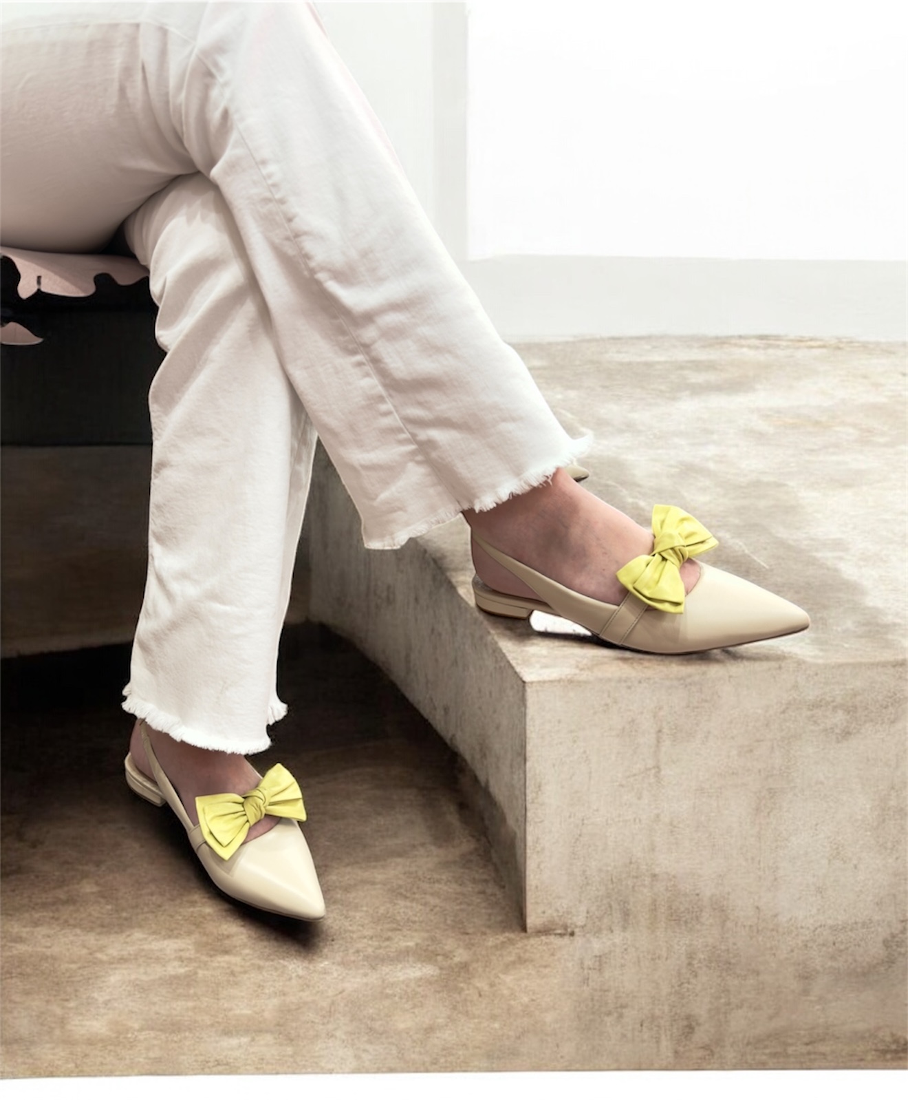 Confeccionadas en cuero liso color cream, estas puntillas se realzan con un lazo en cuero baby yellow, creando una combinación fresca, elegante y sofisticada.