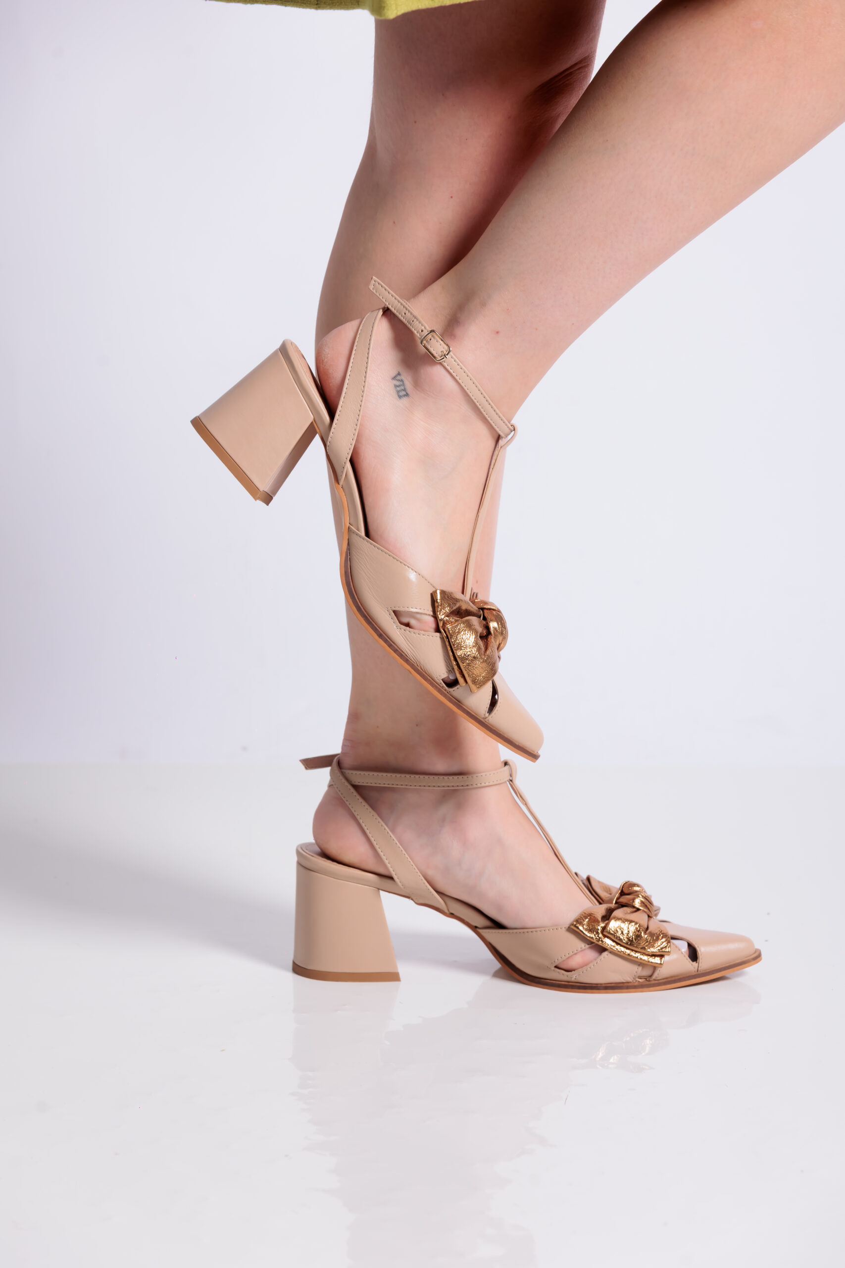 Diseño en cuero nude con tacón cuadrado de 5 cm, tiras envolventes en el tobillo y un delicado lazo en cuero metalizado bronce. Una pieza única, elegante y versátil que acompaña a novias, madrinas o eleva tu estilo en el día a día con un toque de distinción.