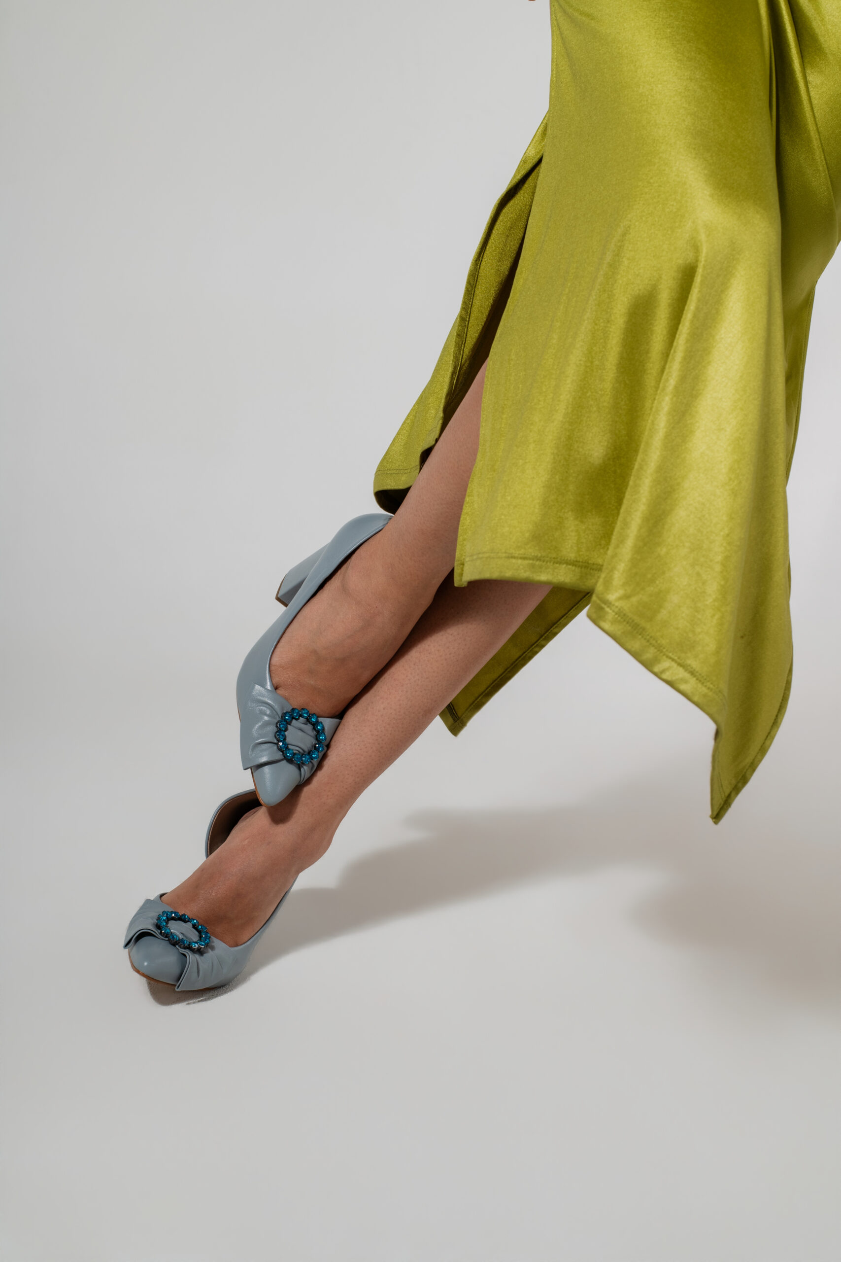 Eliana es nuestro tacón de 8 cm en cuero celeste baby, con lazo celeste y cristales que elevan cualquier look.