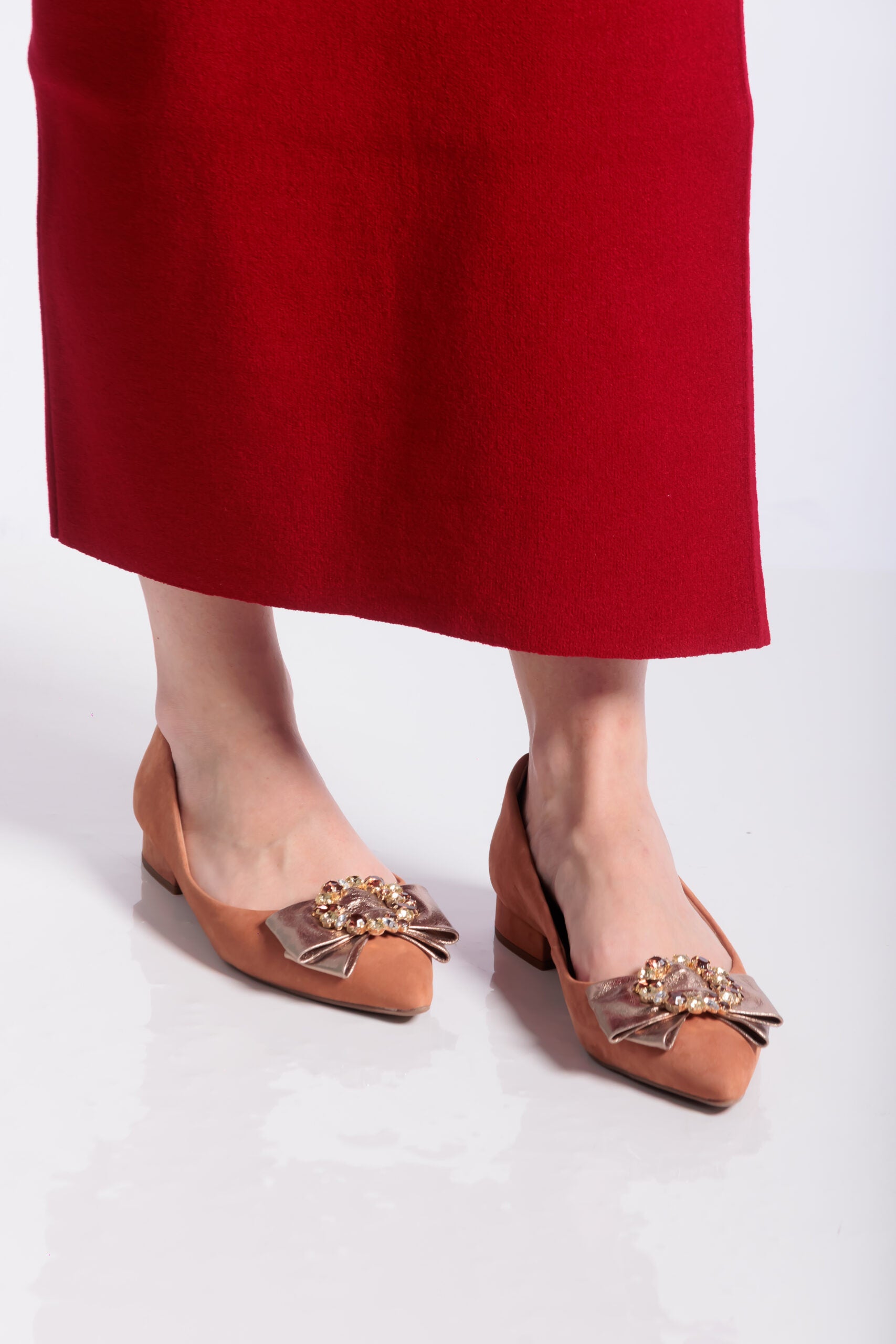 Ballerina en cuero gamuza ambar con taco de 2 cm y delicado lazo en cuero metalizado bronce, decorado con cristales ambar.